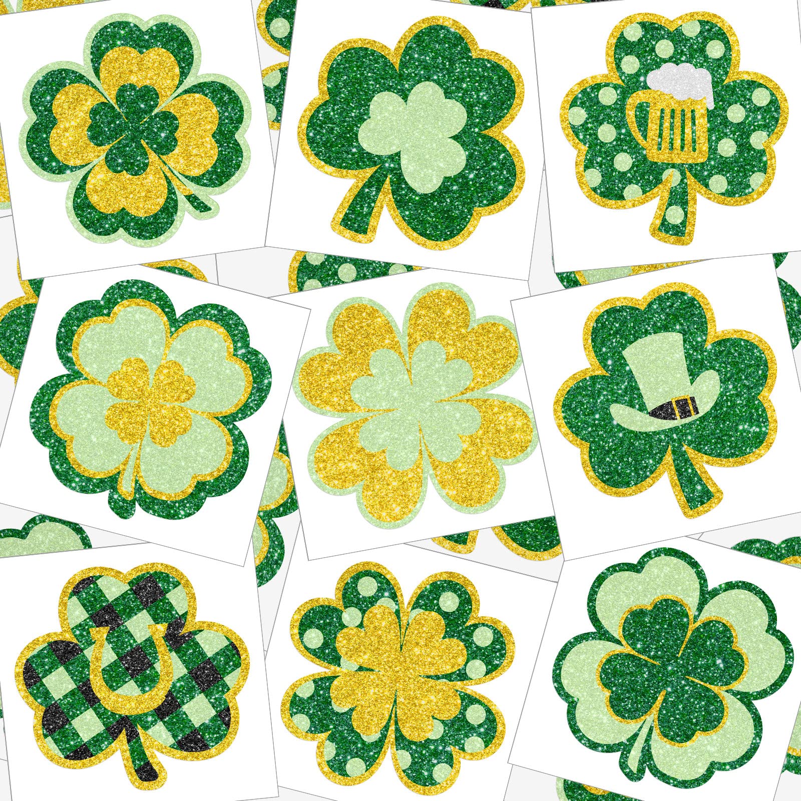 - St Patrick's Day Themed Tattoos: the glitter shamrock tattoo stickers are design in 9 lovely and colorful 4 leaves, full of festival and vibrant atmosphere, adopting traditional and classical holiday elements, so ideal for your application during the St Patrick's Day