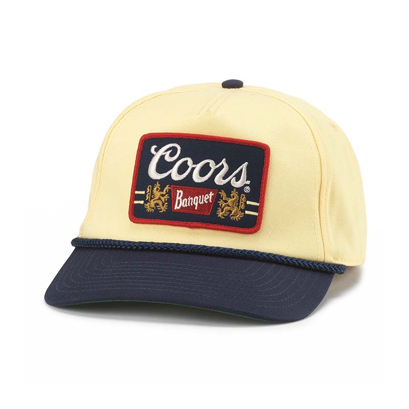 Washed Twill 5-panel with soft structured crown and slight curved visor. Braided nylon cord across seam and plastic snap closure. Front logo is merrowed twill patch or embroidery.