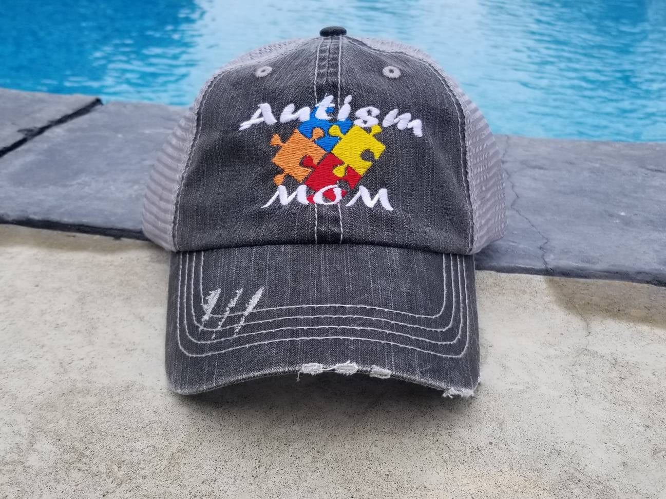 Autism MOM, DAD, BROTHER, SISTER, AUNT, UNCLE, GRANDMA, GRANDPA, NANA, PAPA, WIFE, HUSBAND, GRAMMY, PAWPAW, MAWMAW and TEACHER are all embroidered on a black low profile cap with a silver gray mesh back.