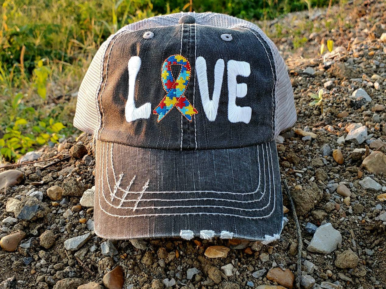 Autism Love is all embroidered on a black low profile cap with a silver gray mesh back. The cap we embroider is on the Mega Cap brand, which is Top Quality. The soft front and soft mesh is excellent for all day wear and comfort. The embroidery thread is white for the LOVE. The ribbon itself is of multi-colored puzzle pieces.