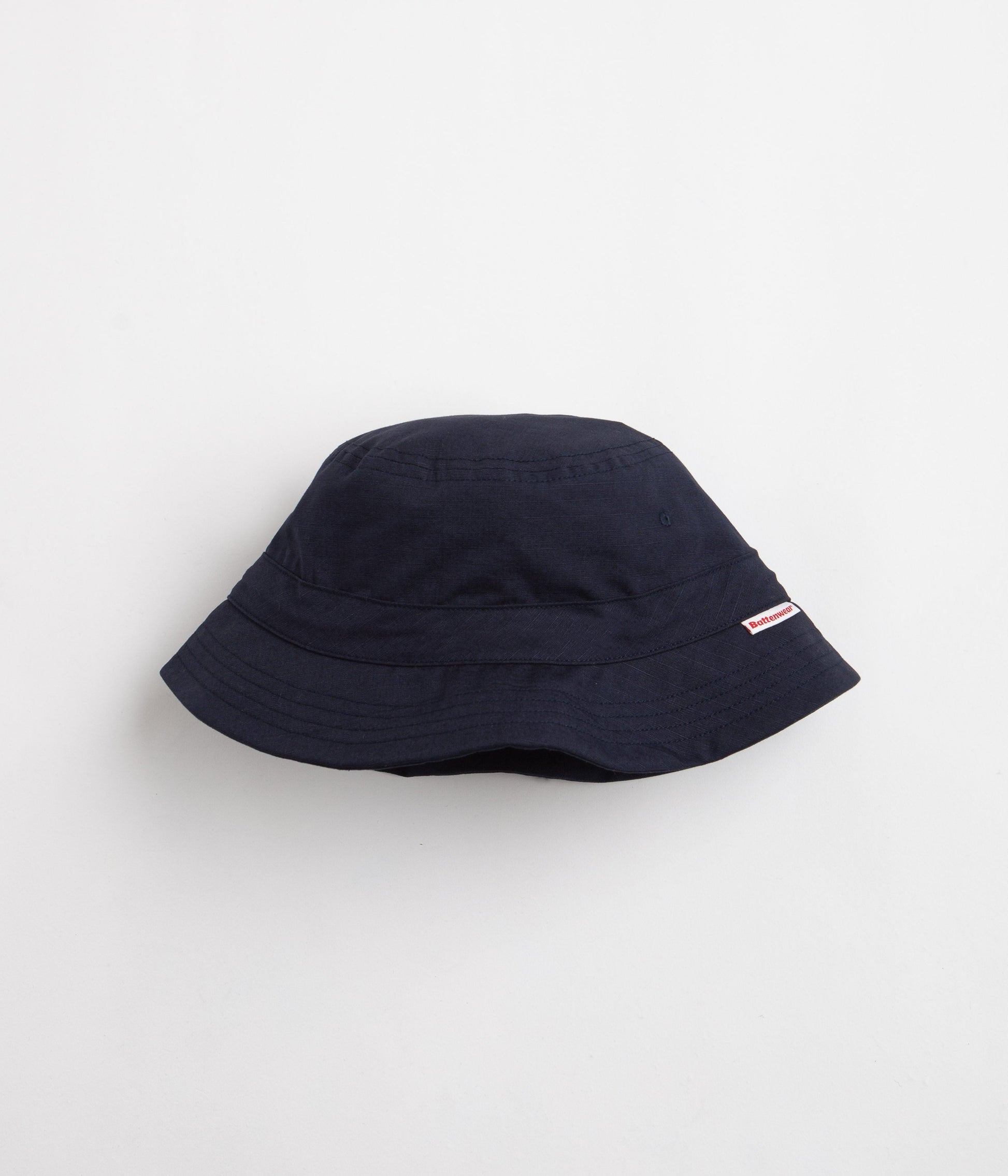 Battenwear Camp Crusher Hat in Navy Ripstop. Water-repellent and single sized, this Battenwear hat is crafted from 100% cotton ripstop with a bendable foam visor. Featuring an adjustable toggle cord fastening and embroidered ventilation eyelets, this navy Battenwear bucket hat is finished with woven flag label branding.