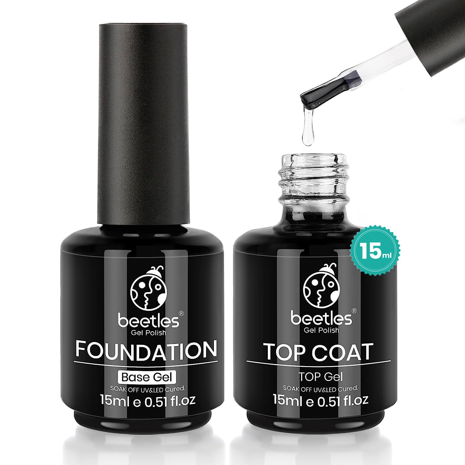 Beetles 2 Pcs 15ml No Wipe Gel Top Coat and Base Coat Set - Shine Finish and Long Lasting, Soak Off LED Nail Lamp Gel Base Top Coat Finish Nail Art Design Manicure Gifts for Women