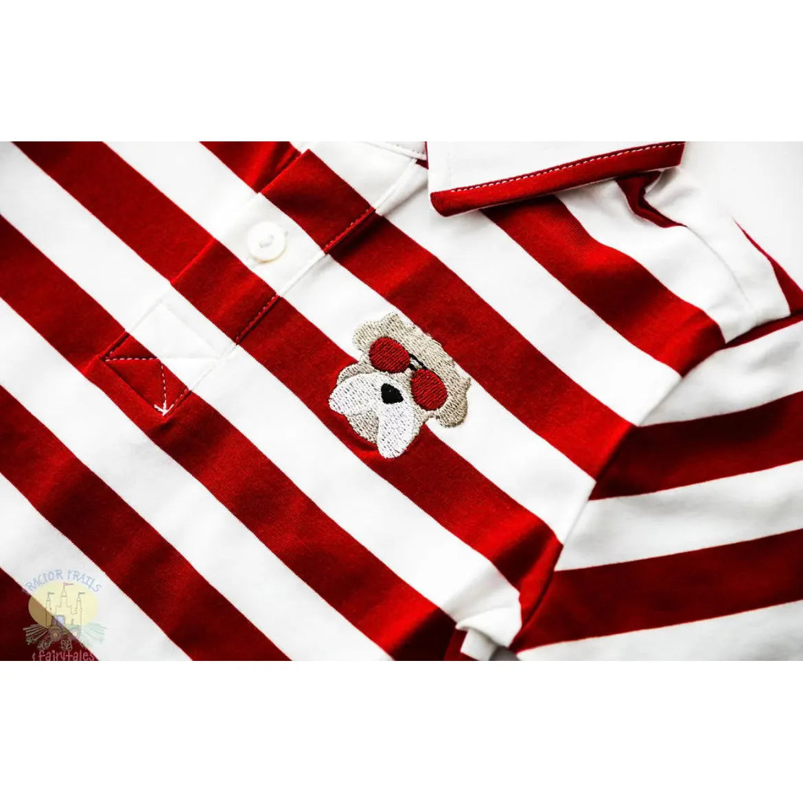 Show off your team pride and style with our Bulldog Embroidered Stripe Polo! This maroon and white stripe polo t-shirt features an embroidered bulldog on the chest, perfect for game day. Elevate your fan apparel with our classic and stylish polo.