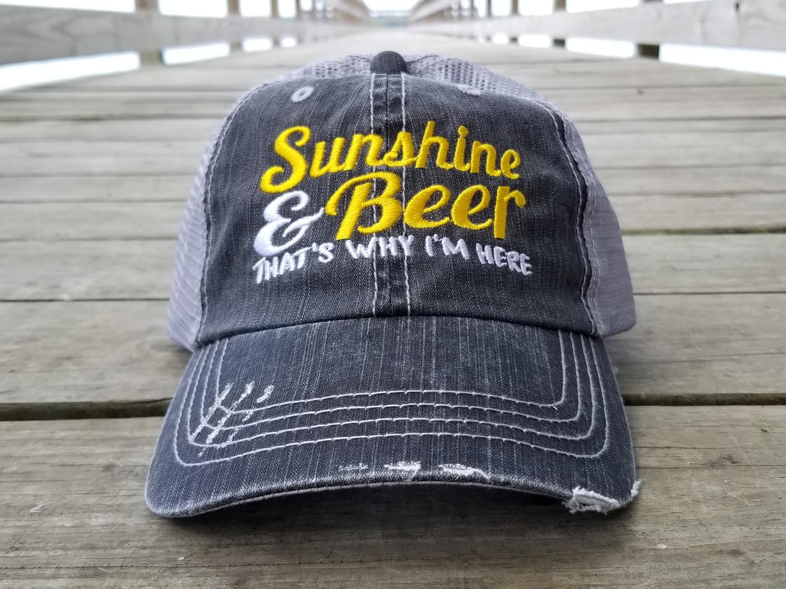 The Sunshine and Beer Hat is embroidered on a black low profile cap with a silver gray mesh back. The cap we embroider is on the Mega Cap brand, which is Top Quality.