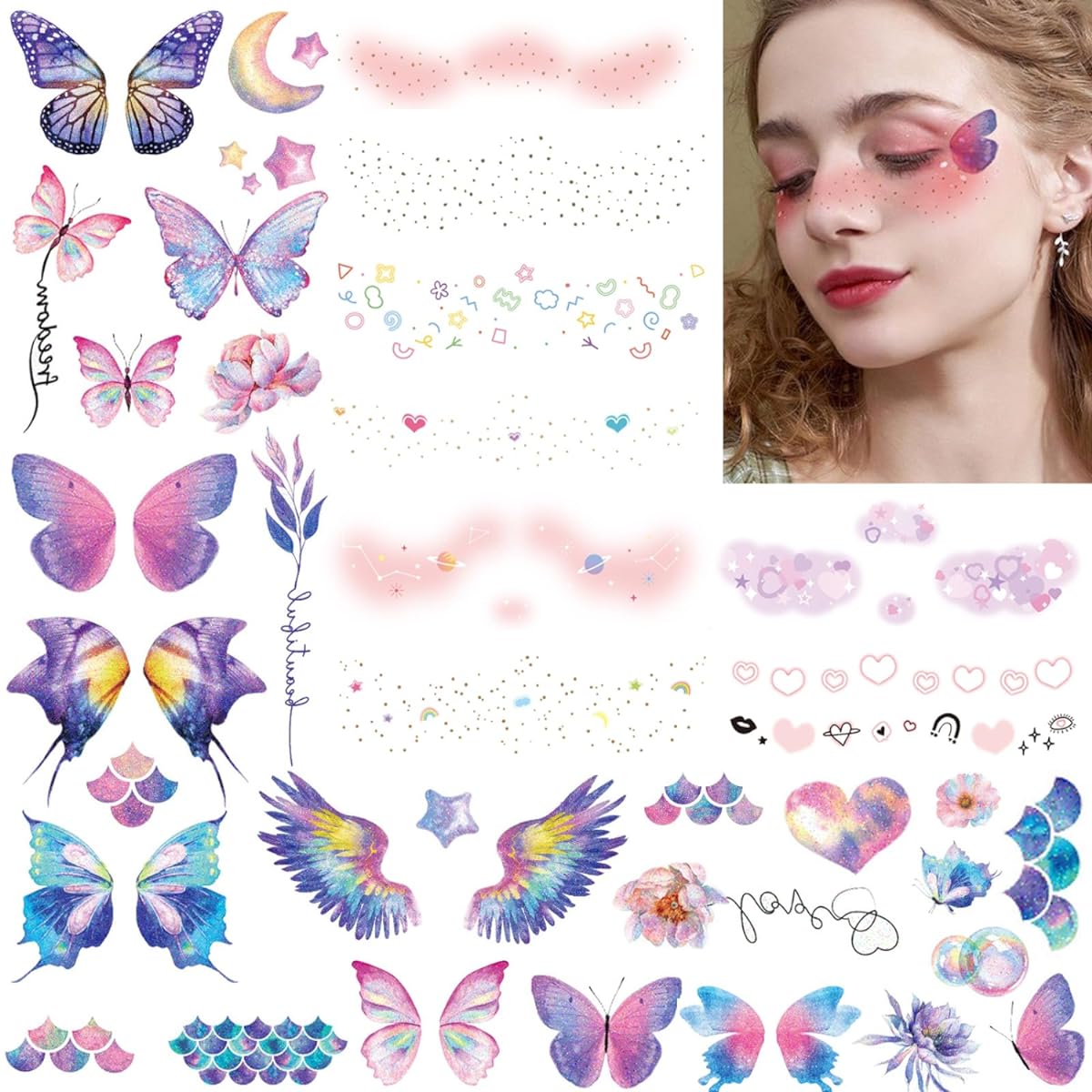 About Product: Package Include:Face Freckle Sticker butterflies Temporary Tattoo How To Use: 1. Cut out tattoo of choice and remove the transparent film. 2. Place tattoo face down on skin. 3. Wet the tattoo thoroughly with a sponge or towel. 4. After 30 seconds, gently remove the back paper. 5. Allow tattoo to dry. Note: Not intended for children under 3 years. Do not put directly on eye. Precautions for use:These tattoos are easily removable by rubbing alcohol or baby oil, coconut oil, or olive oil. Wait 10 seconds, rub alcohol or baby oil until removed. please avoid soap, sunscreen and oils to prolong the life of your tattoos if you want to keep it for a few days.